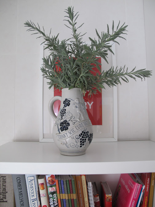 A alfazema que estava na varanda cresceu tanto que já estava a secar por baixo, decidi cortá-la,  aproveitei os ramos e coloquei-os numa jarra no “novo” cantinho da cozinha.