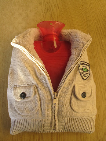 O frio ainda não chegou, mas ao arrumar o roupeiro do meu pequenito, encontrei este casaco que já não lhe servia. Como andava a pensar fazer uma capa em tricot para o saco de água quente, pensei “porque não cortar as mangas do casaco e fazer uma capa?” e pronto a ideia foi posta em prática e o saco de água quente parece ter gostado 😀